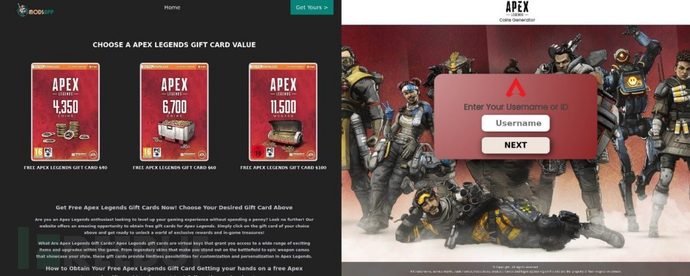 下面的截图就是此类骗局的一个典型示例。犯罪分子向用户提供“免费的Apex传奇礼品卡”。要获得这些奖品,用户必须首先输入自己的用户名,然后回答几个问题,之后再通过支付一定费用来获得奖品。