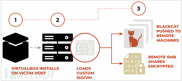 威胁行为者入侵设备后,会安装 VirtualBox 并使用 Munchkin ISO 创建一个新的虚拟机。而该 Munchkin 虚拟机包含一套脚本和实用程序,允许威胁者转储密码、在网络上横向传播、构建 BlackCat \”Sphynx \”加密器有效载荷并在网络计算机上执行程序。