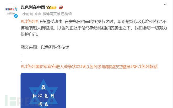 在这条帖子中,以色列驻上海总领事馆放上了“以色列宣布进入战争状态”的热搜。