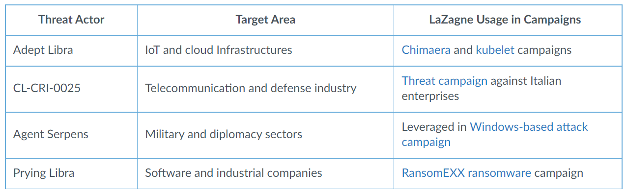 早在2021年7月,Adept Libra(又名TeamTNT)就利用LaZagne作为其Chimaera活动的一部分,从各种操作系统中窃取密码,包括基于云环境的Linux发行版。该活动至少持续到2021年12月,当时Adept Libra使用LaZagne从Kubernetes环境中的WordPress网站窃取密码。