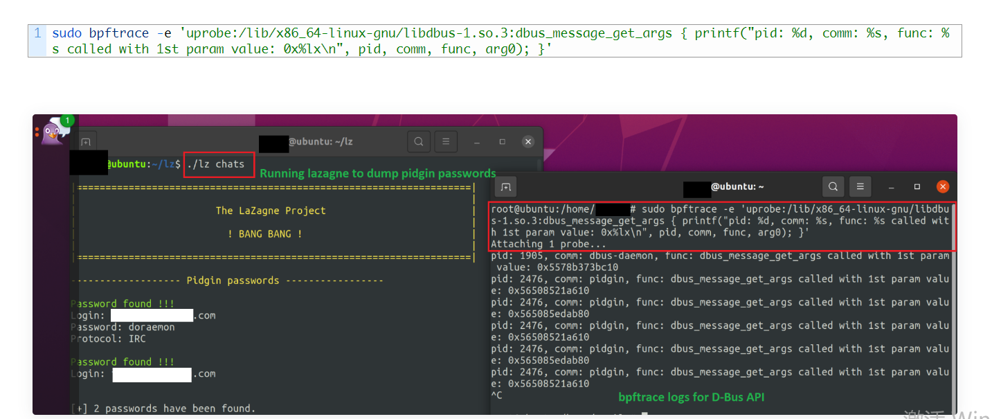 上图显示了Pidgin用户名和密码被LaZagne成功转储(在左侧终端上),API调用被记录在bpftrace输出中(在右侧终端上)。