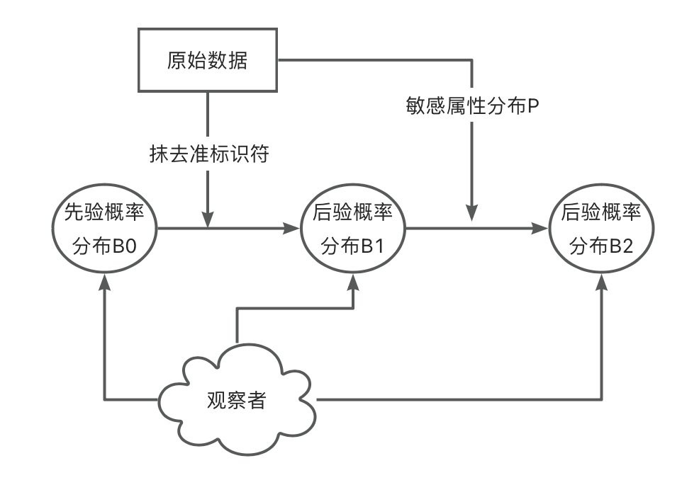 假设在看到发布的数据集之前,观察者对个性敏感属性的先验看法(prior belief)为B0B0,给观察者一个抹去准标识符的数据表,表中敏感属性的分布为 QQ,根据 Q,观察者的后验看法(posterior belief) 变为B1 。B1