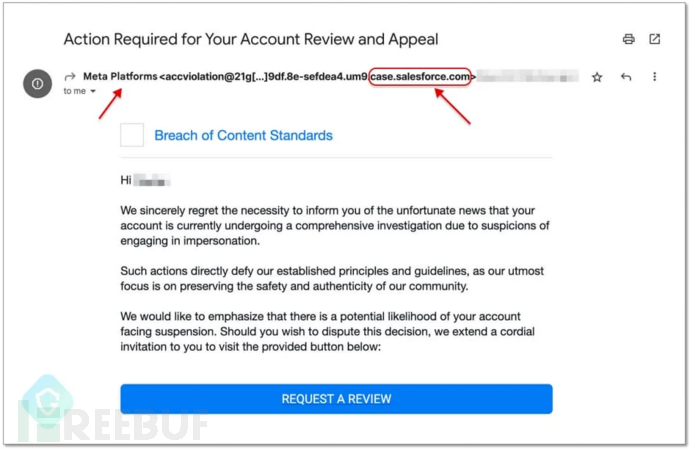 事实上,这就是近期 Guardio Labs 在野外观察到的情况,据称来自 “Meta Platforms ”的网络钓鱼电子邮件使用了 “case.salesforce.com ”域名。