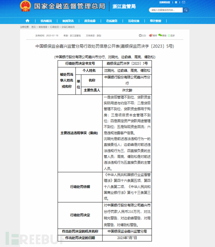 7 月 18 日,一则消息引爆金融和网络安全行业,国家金融监督管理总局依据《中华人民共和国银行业监督管理法》第四十六条第五项、第四十八条第二项,《中华人民共和国商业银行法》第七十三条第三项,对中行嘉兴分行存在的包括“违规泄露客户信息”等 6 项主要违法违规行为处以 210 万元的罚款。
