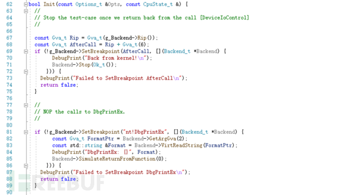 需要注意的是,由于快照不具备 IO 访问能力,发生 IO 操作时 wtf 无法正确处理,所以我们应该尽量选择一个「合适」的快照点;对于无法避免的 IO 操作,我们可以采用 patch 的方式修改逻辑,如 demo 程序中的printf()函数调用,我们在Init()中进行 patch,不会执行真正的printf()功能。