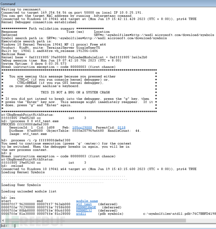 随后使用debugger使用 WinDBG 网络调试连接debuggee,随后在debuggee上执行wtf_test.exe程序,在 WinDBG 中进入目标进程空间如下: