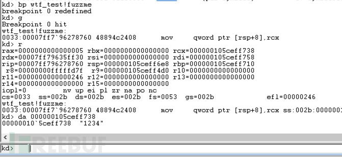 此时,我们需要选择一个「合适」的内存快照位置,因为 wtf 将会以该快照作为起始运行状态,在wtf_test.exe中,我们的目标函数是fuzzme(),所以我们在fuzzme()函数入口打下断点,并在wtf_test.exe程序中分别输入g和1234以运行到断点处,如下: