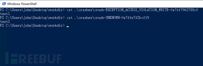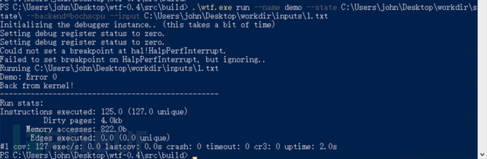 $ .\\wtf.exe run --name demo --state C:\\Users\\john\\Desktop\\workdir\\state\\ --backend=bochscpu --input C:\\Users\\john\\Desktop\\workdir\\inputs\\1.txt