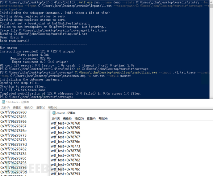 执行完毕后将在C:\\Users\\john\\Desktop\\workdir\\coverage下生成1.txt.trace文件,该文件没有符号化不能直接使用,使用作者提供的工具 symbolizer(https://github.com/0vercl0k/symbolizer</https://github.com/0vercl0k/symbolizer>) 对其进行符号化处理: