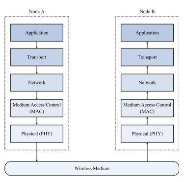 具体而言,首先使用协议开销扩展节点A处的数据包,包括应用层开销、传输层开销、网络层开销、MAC开销和物理层开销。这将产生一个封装的数据包。然后,将得到的数据分组经由无线介质传输到节点B,节点B将执行分组解封装,从物理层开始并向上前进到应用层,以便恢复原始数据分组。
