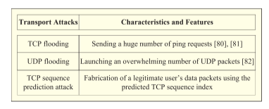 传输层中的恶意活动,重点是TCP和UDP攻击。TCP攻击包括TCP泛洪攻击和序列号预测攻击[10]。TCP泛洪,也称为ping泛洪,是传输层中的DoS攻击,攻击者向受害节点发送大量的ping请求,例如ICMP回显请求,然后通过发送ping回复 (例如ICMP回显回复) 进行响应。当ping请求的数量足够多时,这将淹没受害节点的输入和输出缓冲区,并且甚至可能延迟其与目标网络的连接。TCP序列预测技术是另一种TCP攻击,它试图预测传输节点的TCP数据包的序列索引,然后在该节点上制造TCP包。序列预测攻击者首先猜测受害发射机的TCP序列索引,然后使用预测的TCP索引来制造数据包,最后将其制造的数据包发送给受害接收机。自然,由于上述数据包的制造和注入,TCP序列预测攻击将对数据完整性造成损害。UDP也容易遭受泛洪攻击,这是通过发送大量的UDP数据包而不是TCP泛洪攻击中使用的ping请求来施加的。具体来说,UDP flood攻击者将大量UDP数据包传输到一个受害节点,该节点将被迫发送无数个回复数据包 。这样,受害节点将被恶意UDP数据包淹没,并被其他合法节点无法到达。
