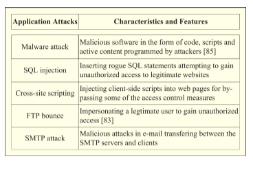 应用层支持web服务的HTTP,文件传输的FTP和电子邮件传输的SMTP。这些协议中的每一个都容易受到安全攻击。从逻辑上讲,应用层攻击因此可以分为HTTP攻击,FTP攻击和SMTP攻击。更具体地说,HTTP是设计用于在万维网上交换超文本的应用程序协议,它受到许多安全威胁。主要的HTTP攻击包括恶意软件攻击 (如木马、病毒、蠕虫、后门、键盘记录器等) 、结构化查询语言 (SQL) 注入攻击和跨站点脚本攻击。术语 “恶意软件” 是指恶意软件,其形式为代码、脚本和活动内容,由攻击者编程,试图破坏合法传输或拦截机密信息。SQL注入通常被利用来攻击数据驱动的应用程序,方法是插入某些流氓SQL语句,试图获得对合法网站的未经授权的访问。最后提到的HTTP攻击类型称为跨站点脚本攻击,通常发生在web应用程序中,其目的是通过将客户端脚本注入web页面来绕过某些访问控制措施 (例如,相同的来源策略)。FTP用于从一个网络节点到另一个网络节点的大文件传输,这也表现出一定的安全漏洞。FTP反弹攻击和目录遍历攻击经常发生在FTP应用程序中。FTP反弹攻击利用端口命令,以便通过以下方式请求访问另一个受害者节点的端口,充当中间人。但是,我们注意到,默认情况下,大多数现代FTP服务器都配置为拒绝端口命令,以防止FTP反弹攻击。目录遍历攻击试图通过在验证用户提供的输入文件名期间利用任何潜在的安全漏洞来获得对合法文件系统的未经授权的访问。与FTP相反,SMTP是一种应用层协议,旨在通过Internet传输电子邮件,但是,它不会加密私人信息,例如登录用户名,密码以及在SMTP之间传输的消息本身服务器和客户端,从而引起了极大的隐私问题。此外,电子邮件是病毒和蠕虫的频繁携带者。因此,SMTP攻击包括密码 “嗅探” 、SMTP病毒和蠕虫以及电子邮件欺骗。通常,采用防病毒软件或防火墙 (或两者) 来识别和防范上述应用程序层攻击。