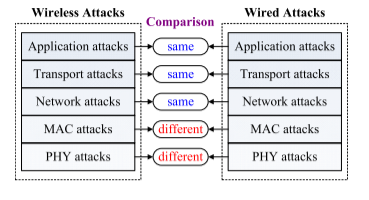 前文我们对无线网络的攻击方式进行了总结与介绍,我们可以将其与有线网络进行并对比。如图9所示,无线网络的应用层、传输层和网络层攻击与有线网络的攻击相同,因为无线网络和有线网络在应用层、传输层和网络层共享公共协议。相比之下,无线网络在PHY和MAC攻击方面与有线网络不同。在无线网络中,传统的安全协议是在MAC层 (有时在逻辑链路控制层) 定义的,用于建立可信的和机密的链路,无线PHY层与基于有线的层完全不同。由于无线电传播的广播性质,无线PHY层极其容易受到窃听和干扰攻击。
