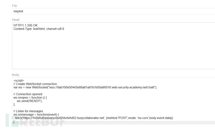 首先通过new websocket与服务端建立连接,然后通过ws.send(\’READY\’)像服务端发送READY。当服务端收到READY字符串时,就会把历史的聊天记录返回回来。这个js收到历史记录以后就可以访问burp的collaborator并带着敏感数据。