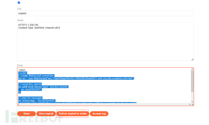 设置好payload,然后让登录的浏览器去访问。在这个靶场也就是点击Deliver exploit to victim