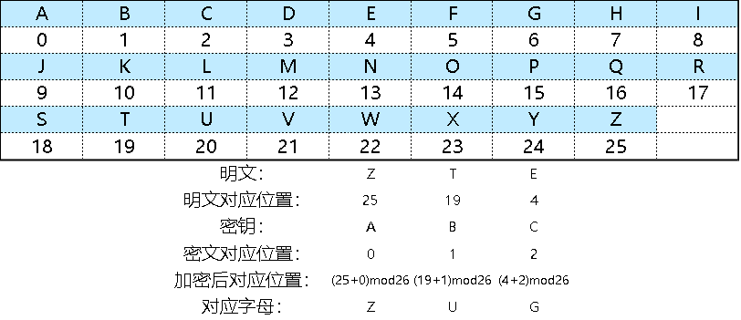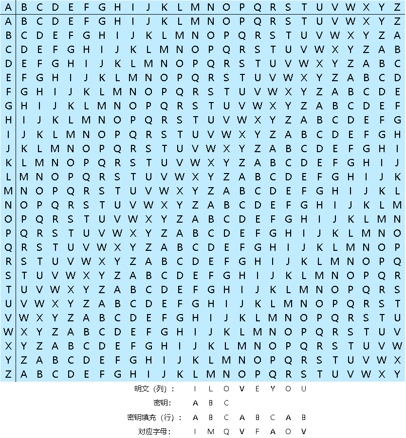 维吉尼亚密码是使用一系列恺撒密码组成密码字母表的加密算法,即在同一消息使用多个字母表的形式进行加密。其中每一位消息对应列序号,填充后的密钥作为行序号,在表中定位行列的交叉处即加密后的字符,从而增加密码的破解难度。
