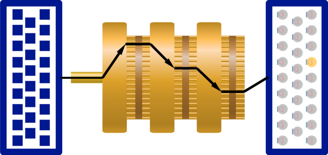 随着机械和机电技术的不断成熟,结合电报和无线电需求的出现,出现了专用于加密的密码设备——轮转机。顾名思义,它就是由一个键盘和一系列的转轮组成。每个转轮都是26个英文字母的任意组合。当每个转轮和移动齿轮转动完成时,原来的字母全部替换成加密后的字母。Enigma加密机就是轮转密码的代表,输入的字母通过转轮和移动齿轮后形成新的电路回路,对应加密后的字母所在灯泡点亮。