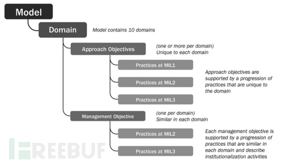 域:域是网络安全的一类主题。该模型有10个域,每个域都包含一组网络安全实践。每组实践都表示组织可以执行的活动,以域为单位建立成熟度模型。