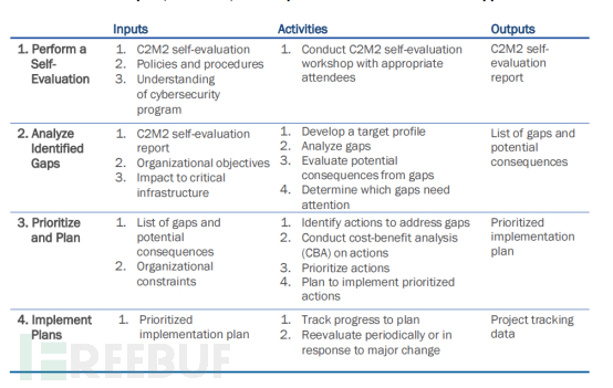 C2M2是一个组织用于持续评估其网络安全能力的模型,下图总结了使用该模型的一种潜在方法。组织对模型进行自我评估,使用该自我评估来识别能力上的差距,对这些差距进行优先排序,并制定解决它们的计划,并最终实施解决差距的计划。随着计划的实施,业务目标不断变化,风险环境的演变,过程不断重复。