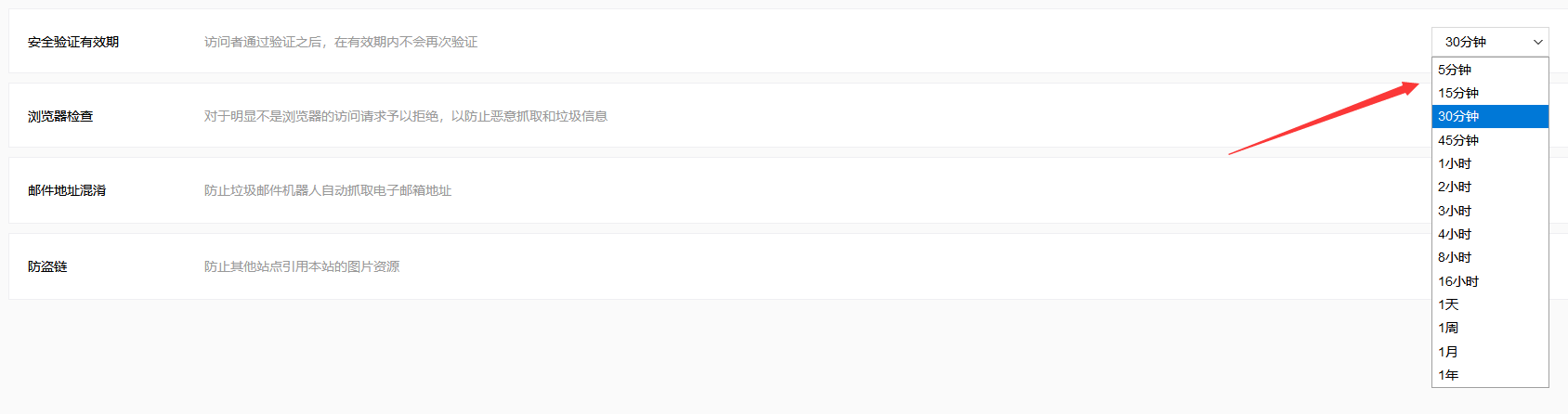进入安全功能-WAF- 安全验证有效期:调为15分钟或者5分钟。如果对方代理IP比较多,调低安全验证有效时间减少服务器的压力,对CC防御更有效。