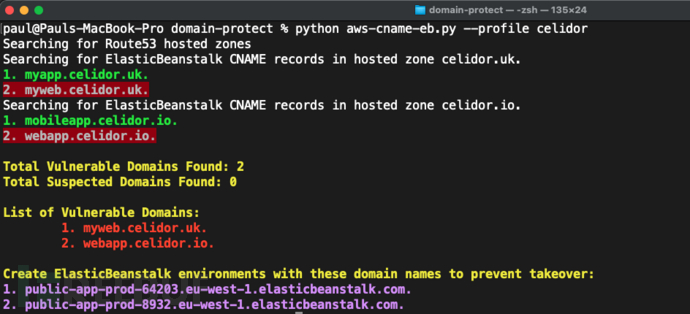 - 扫描一个AWS组织中的Amazon Route53,并获取存在安全问题的域名记录,然后尝试执行域名接管检测;