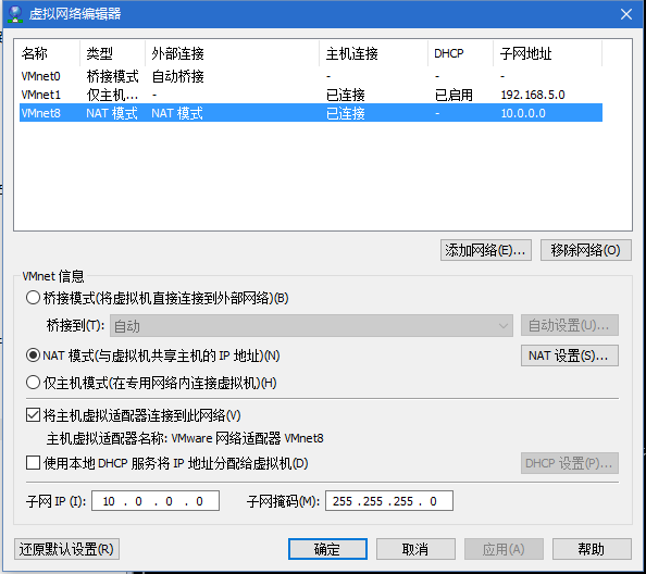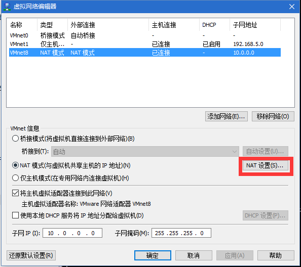 GATEWAY=10.0.0.2 #添加网关,根据VMware 软件‘虚拟网络编辑器'中的子网配置