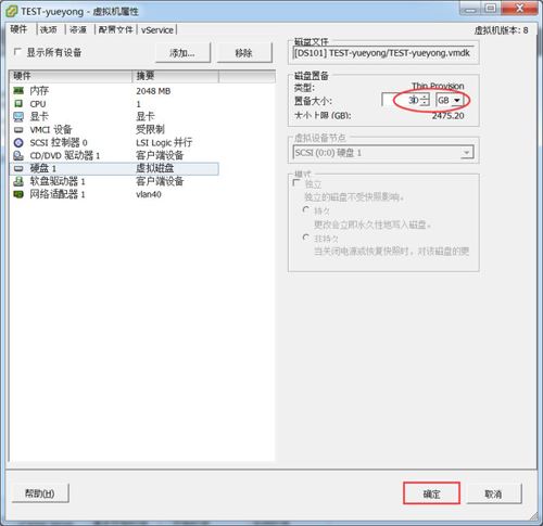 硬盘空间为20G,使用vSphere Client增加磁盘大小,需要再增加10G空间;