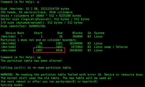 使用fdisk工具先删除/dev/sda4分区,然后创建新分区,注意开始的磁柱号要和原来的一致(是保证数据不丢失的关键步骤),结束的磁柱号默认回车使用全部磁盘。