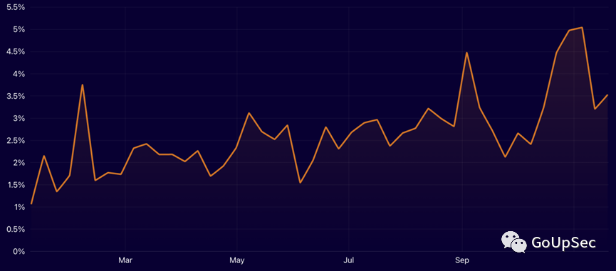 虽然电子邮件安全始终是企业网络安全防御的重要环节,但是2023年电子邮件安全态势进一步恶化。根据Cloudfare Area1分析报告,2023年平均有2.65%的电子邮件被发现是恶意的,且呈现上升趋势。按周计算,2月初、9月初和10月下旬恶意电子邮件占比分别飙升至3.5%以上、4.5%和5%以上(下图)。