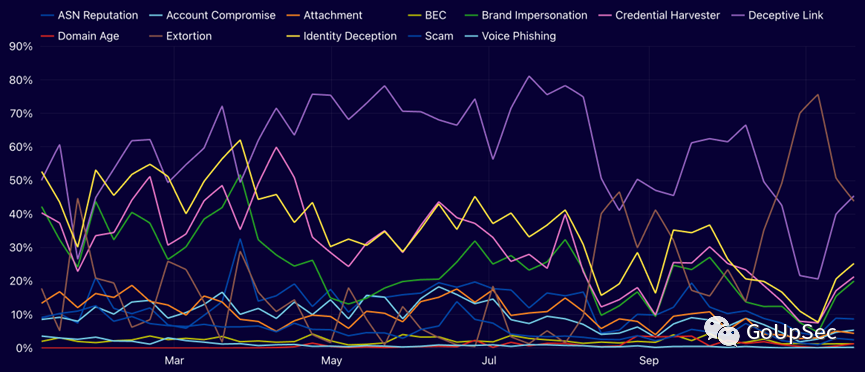 恶意链接、身份窃取依然是2023年最主要的电子邮件威胁,敲诈内容在十月份出现了一个短暂的高峰,各邮件威胁类型的变化如下: