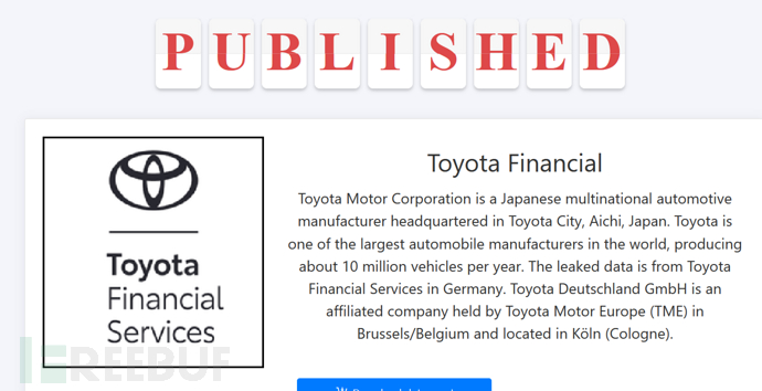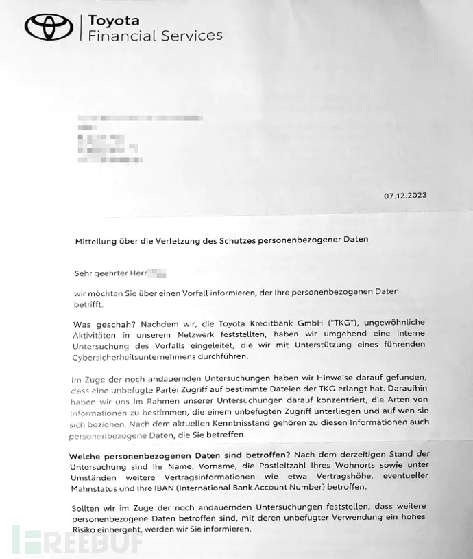 德国网站 Heise 收到了丰田公司发给德国客户的数据泄露通知,通知中提到:在此次事件中,黑客获取了包括用户全名、居住地址、合同信息、租赁-购买详情和 IBAN(国际银行账号)等信息。丰田信贷银行的系统已从 12 月 1 日起逐步重新启动。