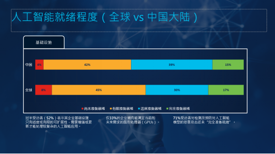 在基础设施方面,全球 95% 的企业意识到人工智能将增加基础设施工作负载,但在中国,只有 40% 的企业认为其基础设施具有高度可扩展性。半数以上(52%)的企业认为其现有的IT基础设施在面对新的人工智能挑战时具有适度或有限的可扩展性。为了适应人工智能日益增长的功率和算力需求,近三分之二(67%)的企业将需要更多的数据中心图形处理器(GPUs),以支持当前和未来的人工智能工作负载。