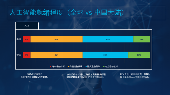 在人才准备方面,报告显示董事会和领导团队最有可能接受人工智能带来的变化,分别有89%和90%的受访者表现出高度或中度的接受度。超过三分之一(36%)的企业表示员工不愿意采用甚至抵制人工智能。对人工智能技能的需求显示出一种新时代的数字鸿沟。