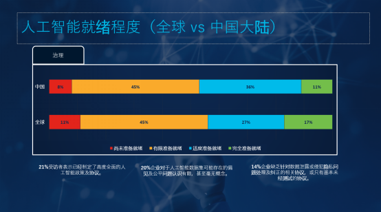 在治理方面,人工智能政策监管起步缓慢。仅有21%受访者表示,他们制定了高度全面的人工智能政策,企业必须考虑和管理所有可能在侵蚀信心和信任方面存在风险的因素,这是一个亟待解决的问题。