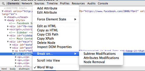 有时DOM像有了自己的想法。当不可思议的变化发生时很难找到问题的根源。 Chrome开发人员工有调试这个问题的超级有用技能。这就是所谓的“Break on…”,你可以通过在元素选项卡上右键DOM节点找到它。
