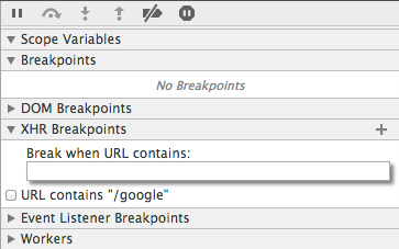 XHR断点或我称作的Ajax断点,也允许当一个预期Ajax请求创建时断开。 当调试你的web应用的网络时这是个让人吃惊的工具