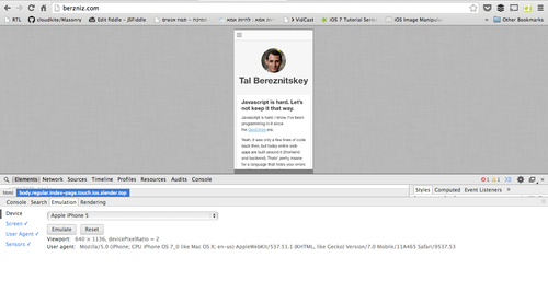 Chrome增加了内置的移动设备模拟工具,这将简化你的日常工作。 选择任何非Console的选项卡找到它们,按键盘上的esc键并选择你想摸你的移动设备。 你当然不会得到一个真正的iPhone,但尺寸、触摸事件和agemt都会为你效仿。