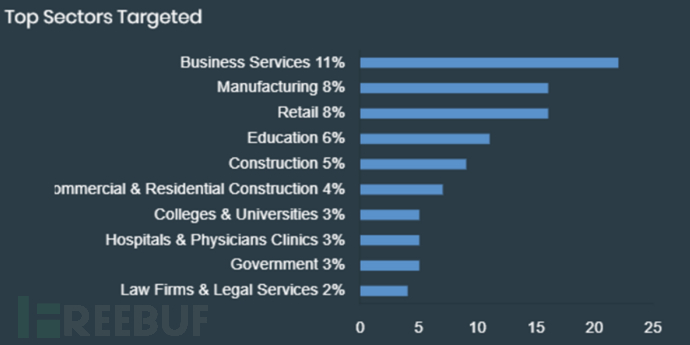 根据遥测数据,NoEscape 勒索软件已经针对多个行业发起攻击。商业服务受该勒索软件的影响最大,其次是制造业与零售业。此外,政府组织、医疗行业也在目标范围。