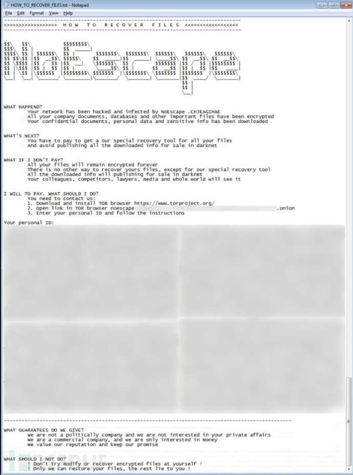 NoEscape 勒索软件会留下名为HOW_TO_RECOVER_FILES.txt的勒索信息,要求受害者通过暗网获取进一步知识。赎金的谈判会在 TOX 上进行,攻击者坚称是出于经济目的进行攻击,与政治无关。