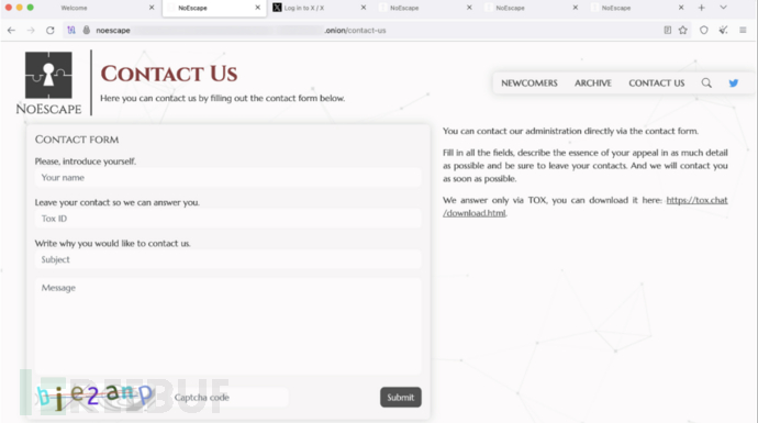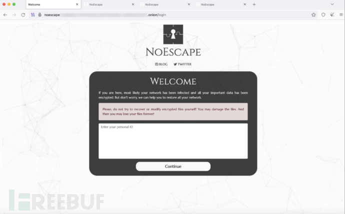 NoEscape 勒索软件拥有一个暗网网站,受害者可以通过该网站与攻击者进行联系,所有窃取的数据与受害者名单都在该网站中进行披露。受害者访问网站时,会被要求提交勒索信息中的唯一 ID:
