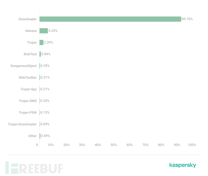- 最常见的威胁是下载程序(70%),其次是广告软件(5.25%)和木马(2.39%)。