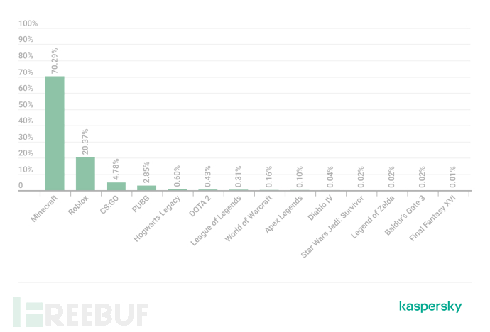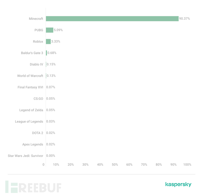 游戏列表是基于互联网上最受欢迎的游戏排名。他们重点分析了手机版和桌面版《我的世界》、《Roblox》、《反恐精英:全球进攻》(CS:GO)、《绝地求生》(PUBG)、《霍格沃茨遗产》、《远古防御2》(DOTA 2)、《英雄联盟》、《魔兽世界》、《Apex传奇》、《暗黑破坏神4》、《星球大战绝地求生》、《塞尔达传说》、《博德之门3》和《最终幻想XVI》相关的威胁。