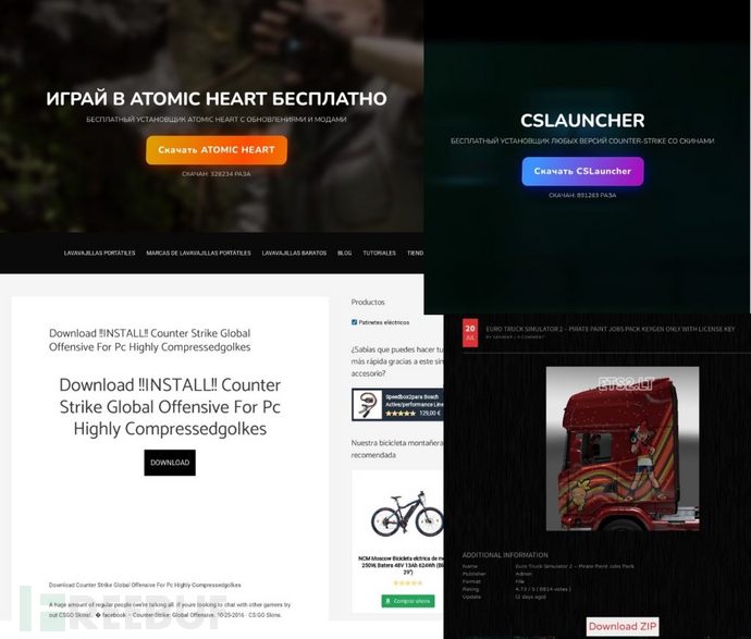 伪装成流行游戏的恶意和流氓软件通常由提供盗版游戏的第三方网站传播。下面的截图就是这类网站的示例,它们可以“免费”下载《原子之心》(Atomic Heart)、《反恐精英:全球进攻》(CS:GO)和《欧洲卡车模拟器》(Euro Truck Simulator)。