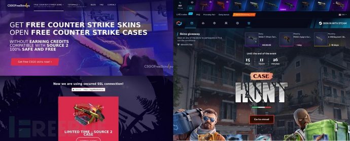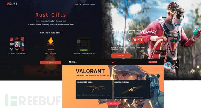 游戏中最受欢迎的诱饵之一便是免费赠送游戏内道具或皮肤。下图截图中的报价很可能会导致用户的Steam或Riot Games账户被盗。这种骗术很简单:想要获得赠品,用户必须登录自己的账户,这意味着在网络钓鱼网站上输入用户凭据。