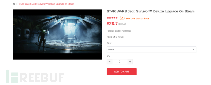 诈骗者经常采取的另一个选择是为热门游戏提供高额折扣。在下面的截图中,一个流氓网站假装以28.7美元的价格出售《星球大战绝地武士:幸存者》,这个价格还不到官方的一半。
