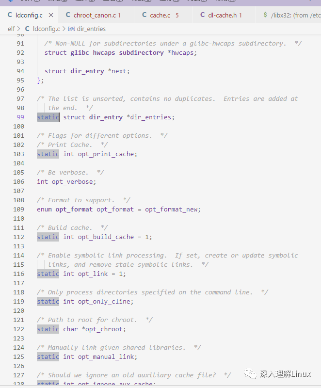 - ldconfig 的代码存在的不足,也是很多C项目的问题,使用了很多全局变量,各个函数到处在直接操作全局变量。虽然功能上没问题,高手写的代码也不会有运行异常,但总感觉可读性和内聚程度降低了。如果是我来实现ldcnfig,我会在内聚性和代码注释方面做一些改进。减少全局静态变量的使用;改成main()内部的变量,且通过main向被调用的函数传参指针参数的方式传入待读写的变量。以此提高可读性。