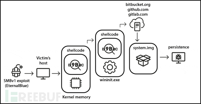 - SMBv1 感染者: 使用定制的 EternalBlue 漏洞利用程序入侵其他 Windows 系统。