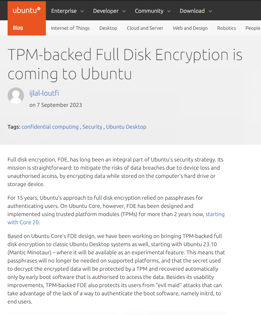Canonical 宣布,Ubuntu 23.10(IT之家注:目前最新 LTS 版本为 22.04.3)将带来实验性的TPM 全磁盘加密功能,作为 Ubuntu 全磁盘加密支持的补充,将适用于经典的 Ubuntu 桌面系统。
