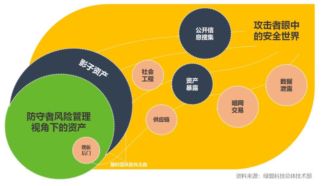 攻击面管理较传统风险管理,最为独特的转变,是其从防守者转换为攻击者视角审视组织的资产、脆弱性、威胁,其维度高于资产管理以及网络空间测绘,同时在风险评估的框架下,通过再度融入威胁和脆弱性,以保护数字资产为目的而进行一系列诸如资产核查、威胁发现相关工作。其不只是从管理范围上进行了延展,同时也从安全效果上得到了验证。